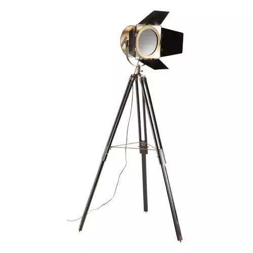 Ce lampadaire en métal prend la forme d’un projecteur monté sur un trépied en métal finition cuivrée.