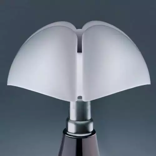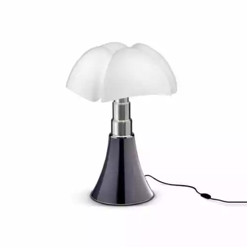 Cette lampe design de petit format à LED intégrée (écologique, économique et plus performante) est composée d’une base tulipée en métal, d’un corps en acier inoxydable brossé et d’un diffuseur en méthacrylate blanc opalin. Elle dispose également d’un câble d’alimentation avec un variateur d’intensité lumineuse.